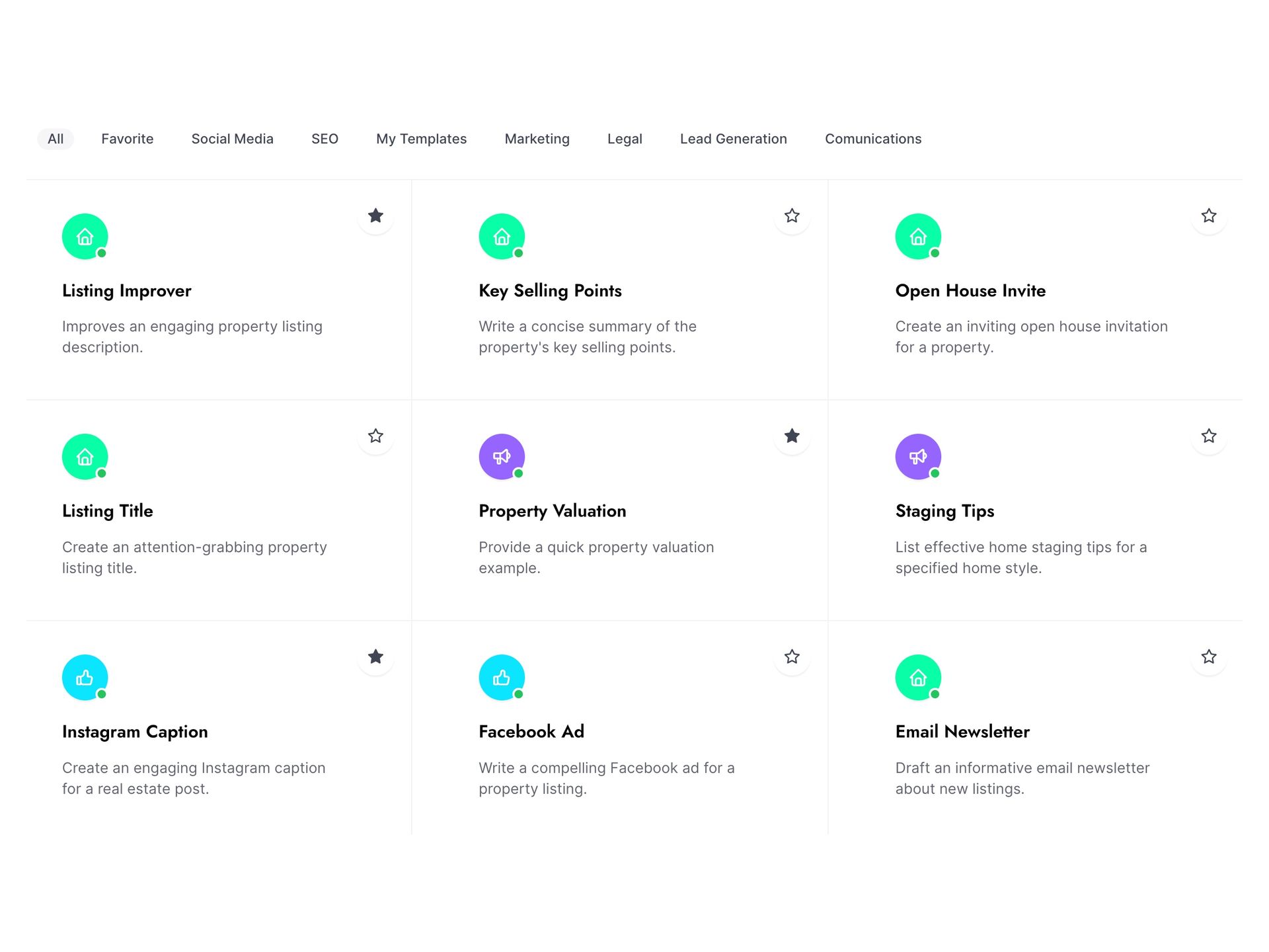 Choose from 200+ real estate–specific templates, from Instagram captions to listing descriptions. Just select, fill in the blanks, and go live with professional-grade content in no time.